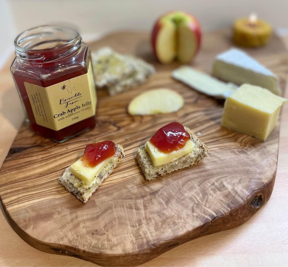 Delicious crab apple jelly made with our own wildflower honey. Perfect accompaniment for cheese, cold meats, or simply spread on fresh bread.